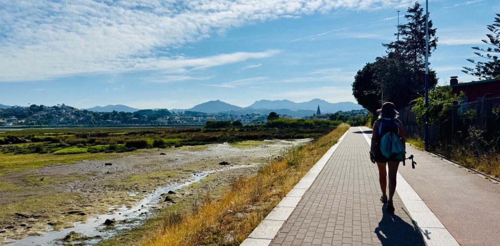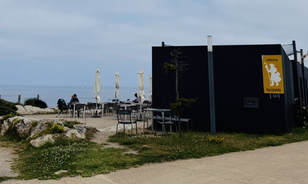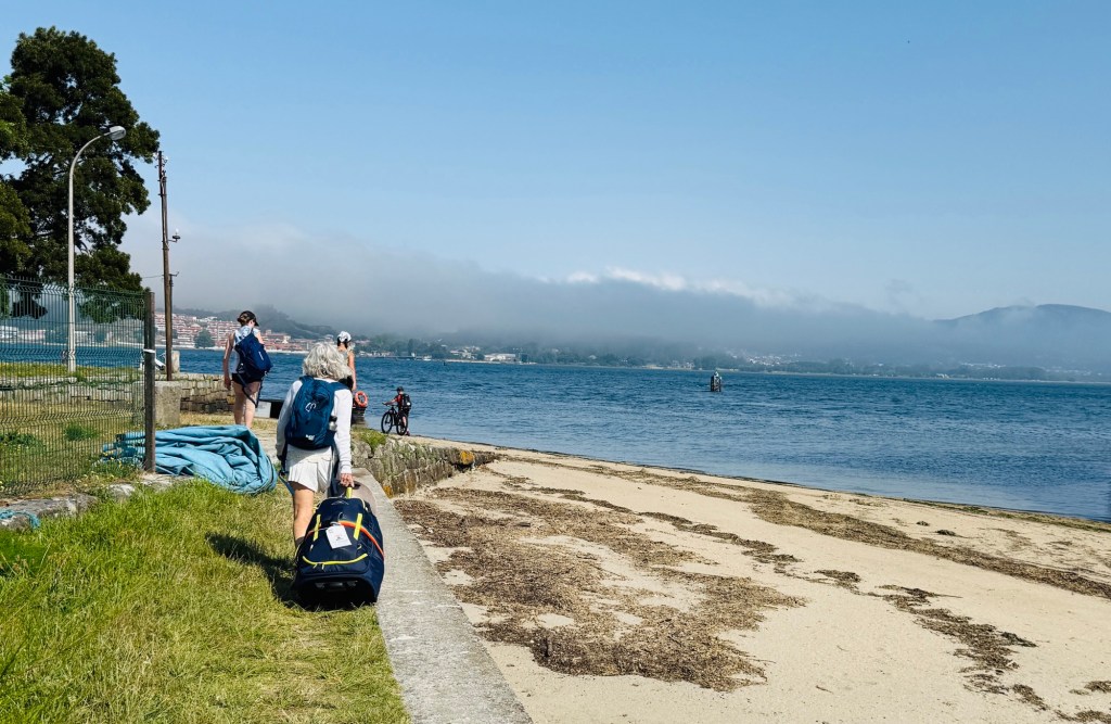 We eventually come across a lovely pilgrim cafe set high off the road with a stunning view of the bay… and we enjoy some kind of meat pie and a wine Spritz (Anne has a beer) for lunch. Here we have our 15km break ( we aim to have a break every 5km) and enjoy conversation with Aisha… our hero from a few days ago who is carrying her 16kg child on her back while she does the Camino. She travels with her parents who carry the packs. Amazing.