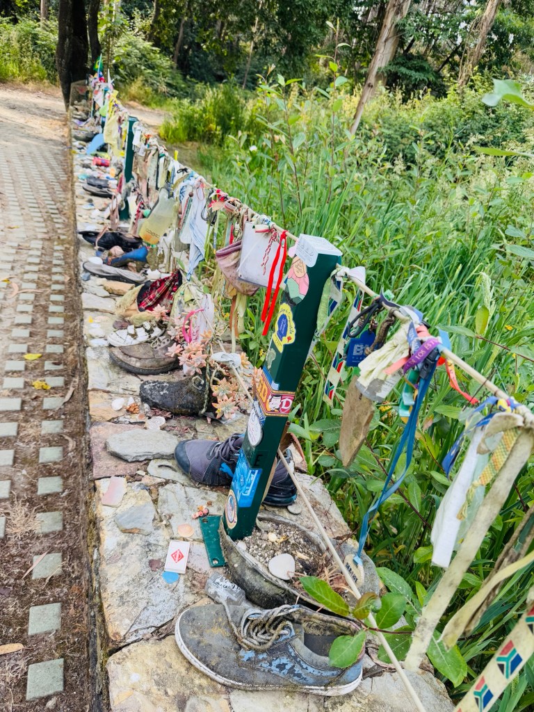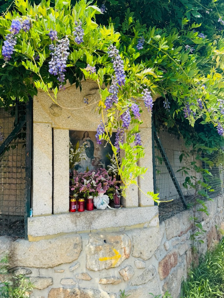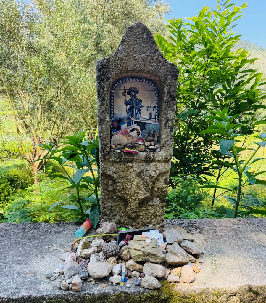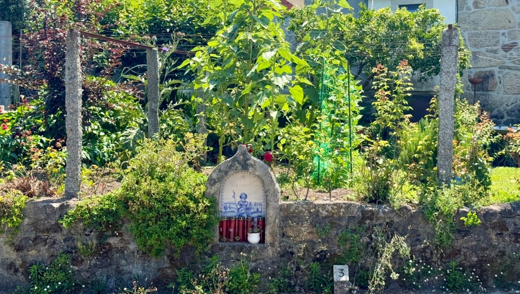The rest of our walk took us through more lovely countryside and small villages where there were more shrines at frequent intervals along the way. Some are decorated with colourful ribbons, prayer cards, a pair of boots, signs, a small stuffed animal, shells, statues, flowers, photos, a rosary, bits of this and that.