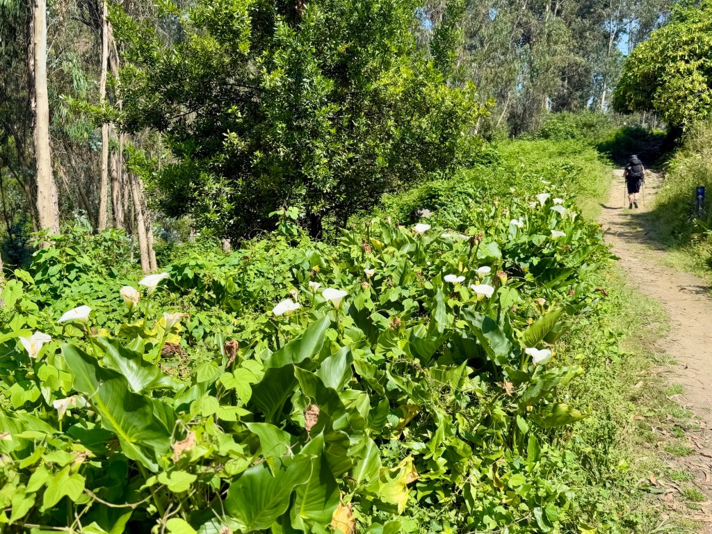At one point, walking over a pass between valleys, we came upon what can only be described as a Fairy Glen; on the lefthand side, the forest filled with wild calla lilies…