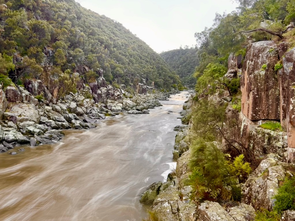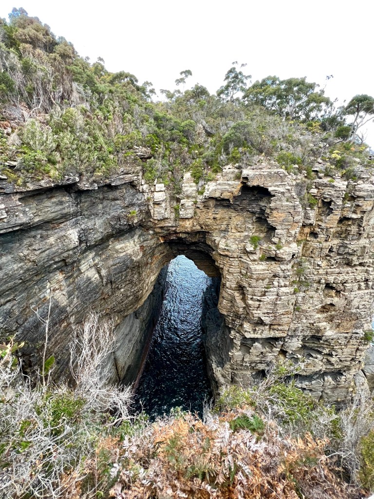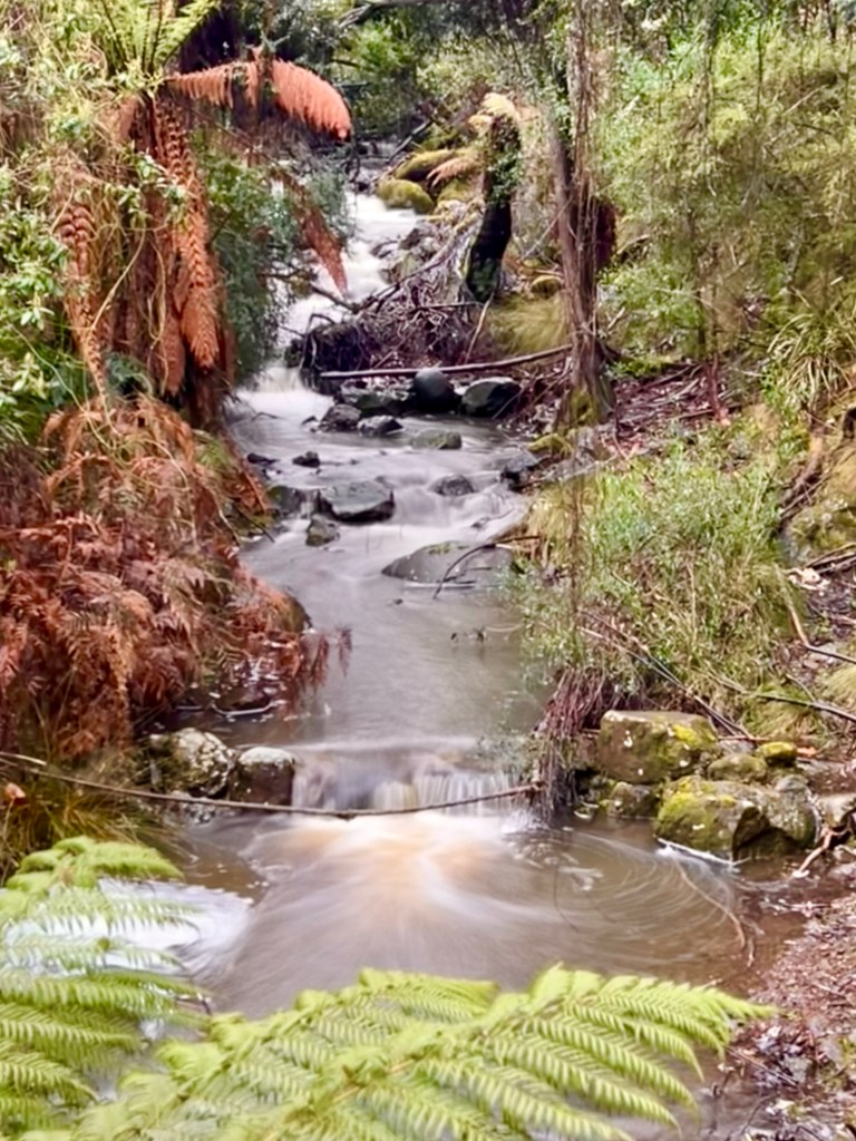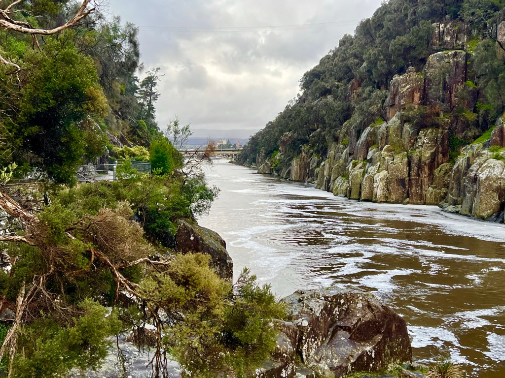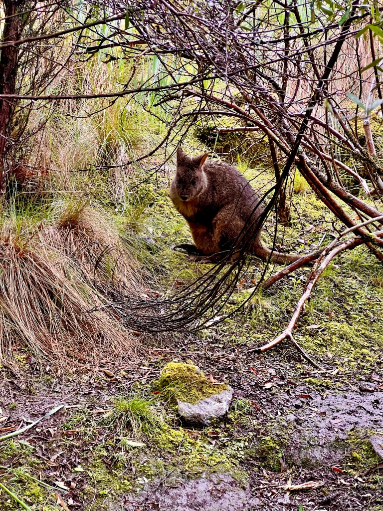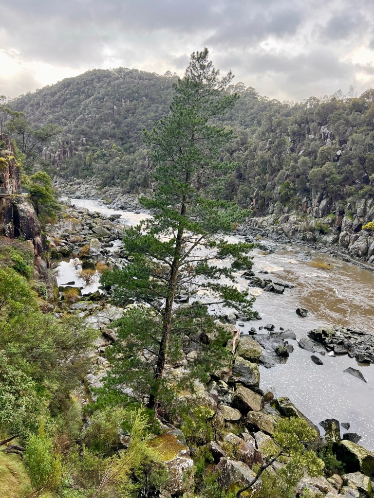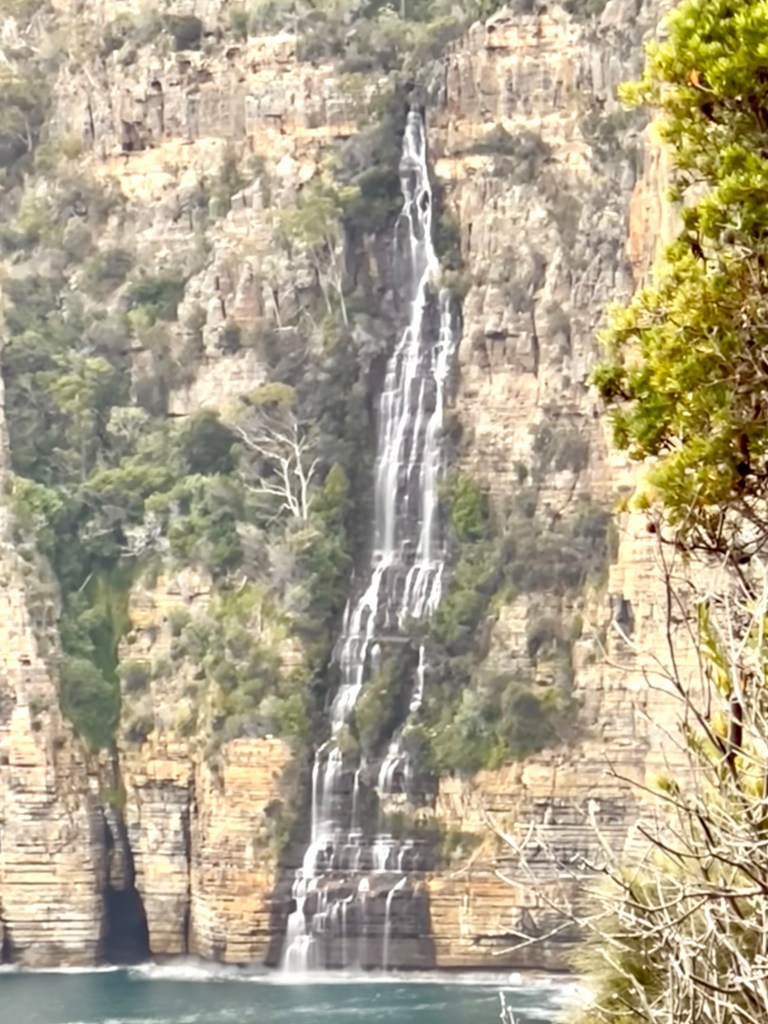 After returning to Strahan, the girls return to our little BnB to warm by the fire while I decide to walk to Hogarth Falls. It is a pretty waterfall, cascading down the sheer, mossy rock face to the log strewn, tanin-stained waters below. A lovely short walk to the waterfall, the tree-fern lined walking track meanders adjacent to Botanical creek beneath stands of towering eucalyptus and through verdant temperate rainforest. It is apparently home to a number of platypus that frolick in the mornings or at dusk… but sadly, despite constant looking, I still haven’t managed to spot one.