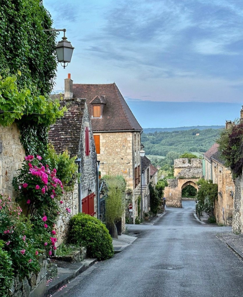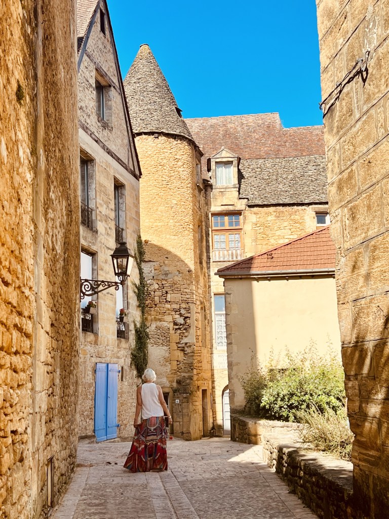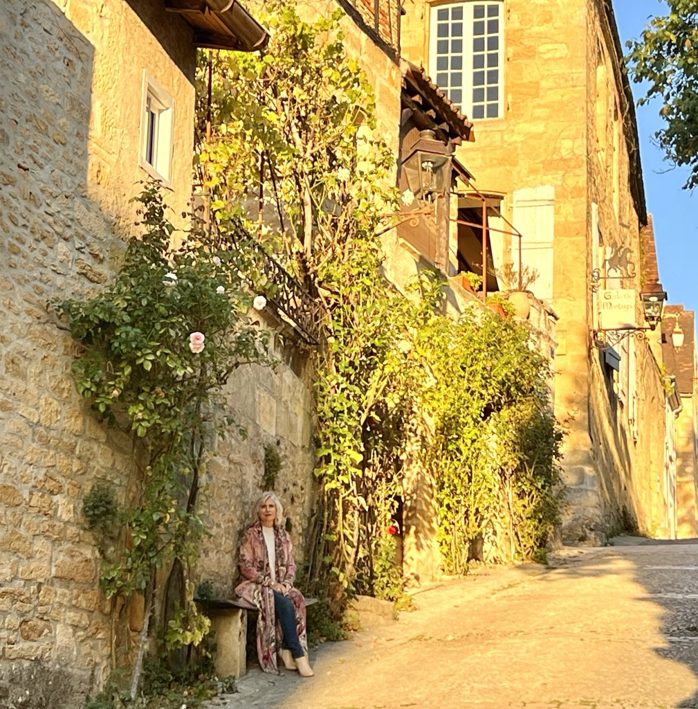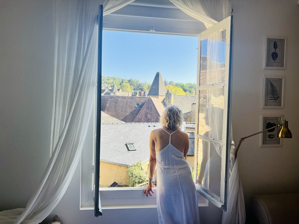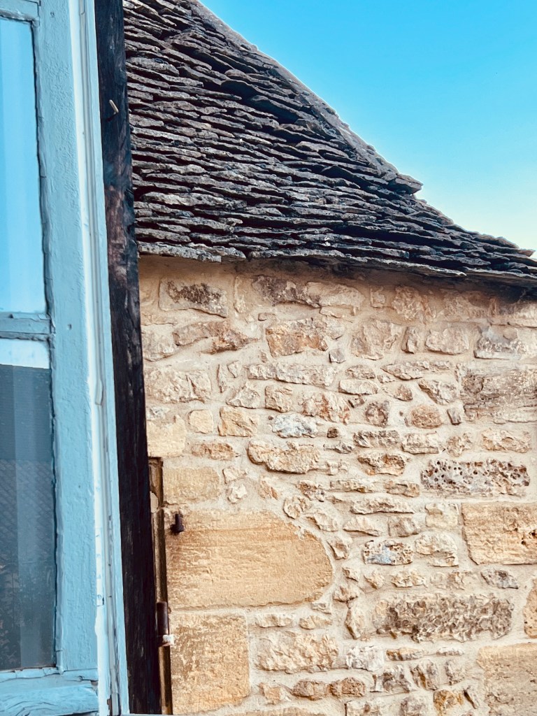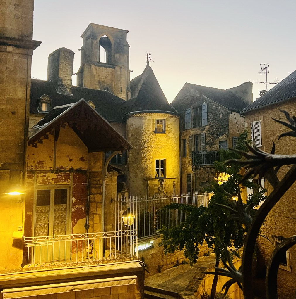 So we left Aix en Provence with our longest travel day of our whole trip ahead of us- four trains and eleven hours on the road (so to speak). The first two trains went smoothly and on time including our longest single train journey of five hours into Ajen. Here we discovered that there was some kind of issue with the trains (not speaking French certainly makes it difficult gathering information) and we would have to get a bus to our next destination, which would take longer than the planned rail leg, meaning we would miss our final connection into Sarlat. Our already long travel day had now turned from eleven hours into thirteen… arriving now at 10.30 pm… certainly too late for dinner. As we would have a nearly two hour wait once we arrive in Siorac we thought we would have dinner here while we waited, but when we arrived, in the dark, we were told it was too far to town for us to walk. Resigned to a long hungry wait, I googled and found it was only a ten minute walk to town..so we left our bags with the lovely young rail attendant (who obviously thought these two sixty something year olds couldn’t walk ten minutes into town 😂) and walked through a very pretty, dark, deserted town and found a little hotel with an open restaurant and had a really delicious meal and much needed wine. Anne put on her google maps (that somehow is determined to lead us astray) and we started to walk back in the dark to the station, using our phone torches to make our way. I questioned when we crossed the railway track as we had not crossed it on our way out… but Anne said , ‘trust me.’ Famous last words! I kept questioning how we would get over to the other side but google was saying there was a way. There wasn’t… and time was getting short. We ended up having to climb a fence, go through a thorny ditch and then walk across the track, all by torch light, to get back to the station. But we did make it onto our last train and finally into Sarlat, where we still had a nearly two km walk dragging our bags to where we were staying. It was certainly a relief when we arrived to our lovely little stone-walled apartment ( which we later realized looked out over the ancient moss-covered rooftops of layered slate)…