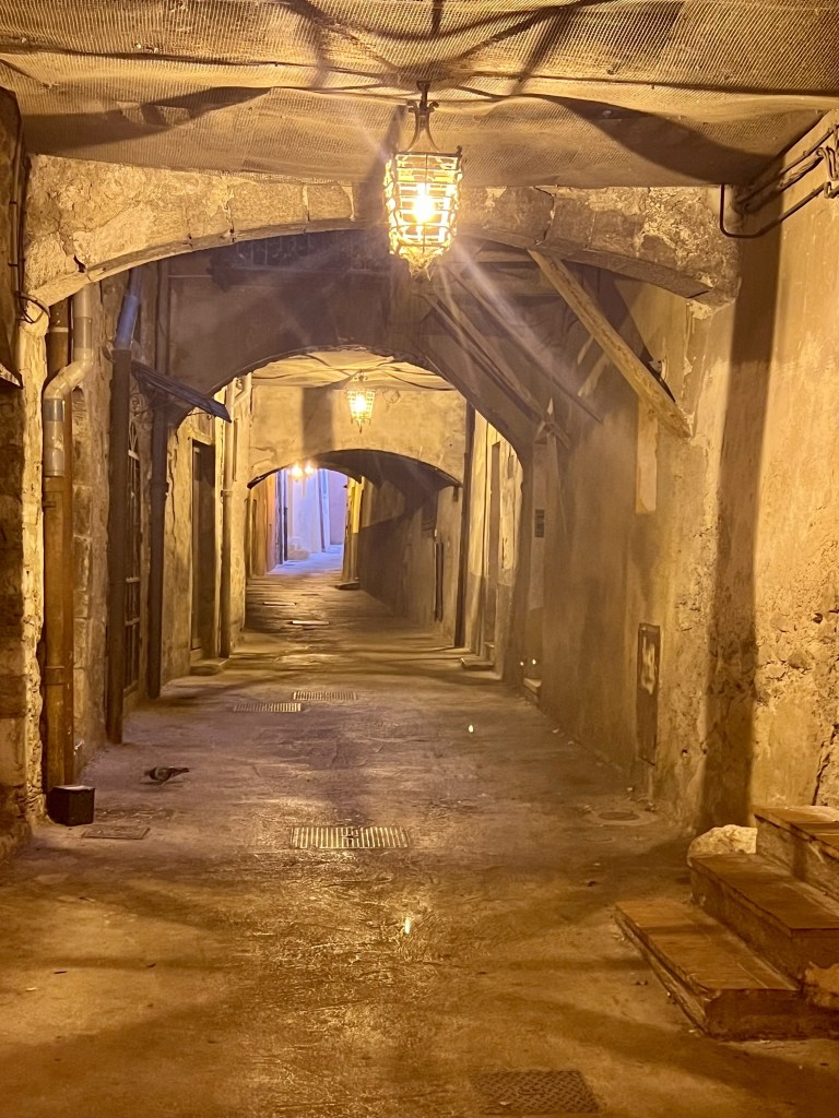… winding cobblestone streets, shaded alleyways, historical buildings and churches, and delicious smelling restaurants. We certainly didn’t need to eat so we wandered around taking it all in…