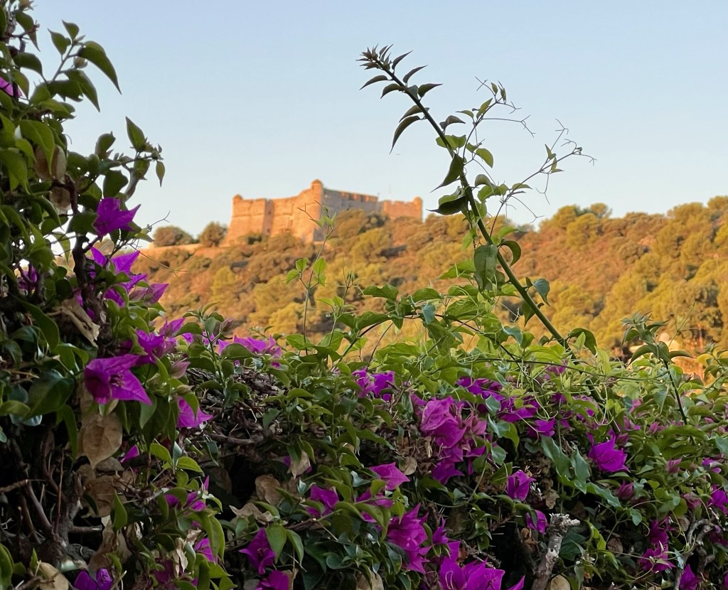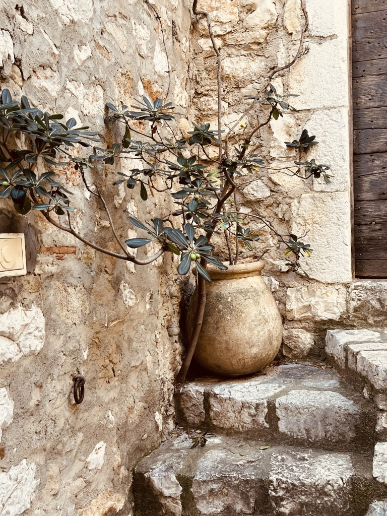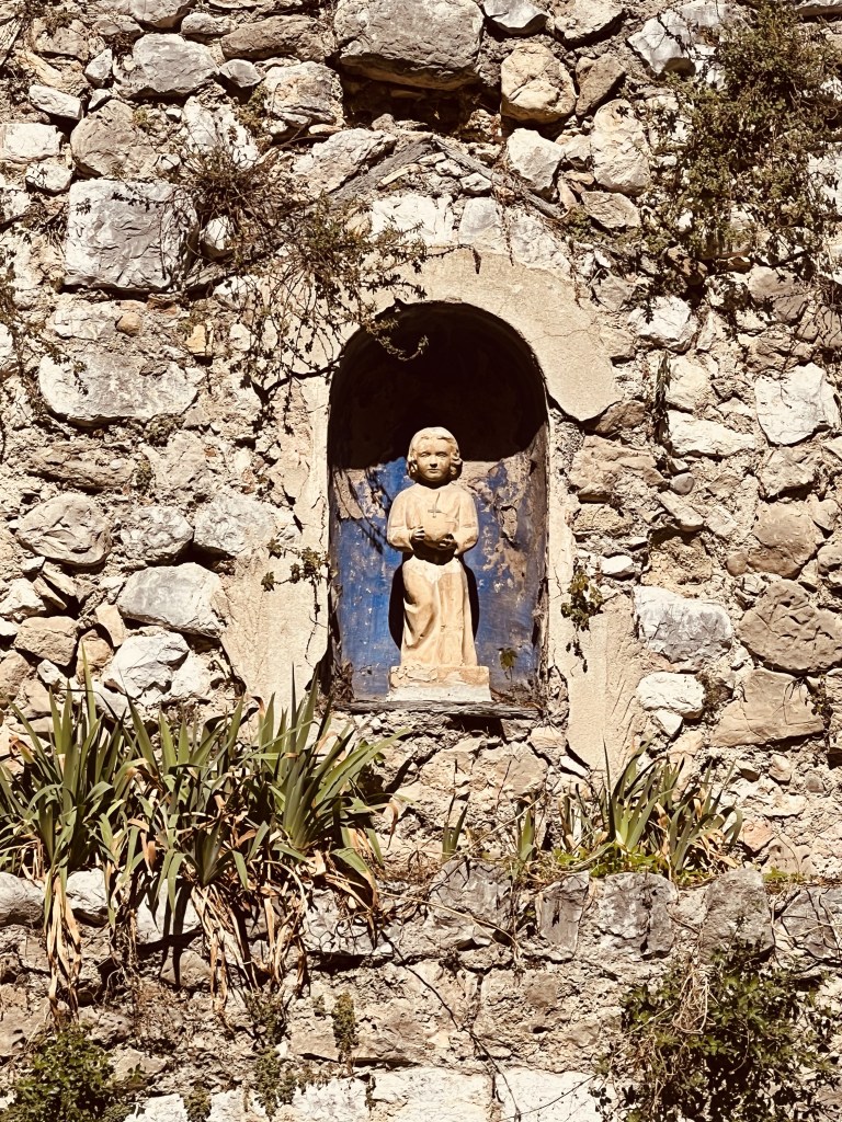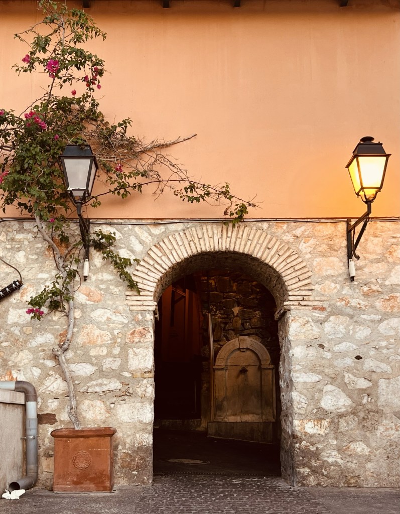 There are none of the bright and beautiful well cared for flower boxes and street decorations of all the previous places we have visited. Here it is much more rustic and lived in… with lots of greenery… and some bougainvillea (sadly past it’s best)… perhaps due to the hotter drier climate.