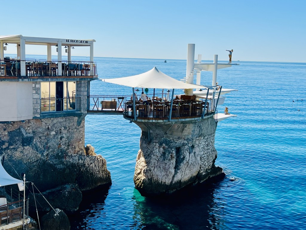 Nice is another charming city in the French Riviera- the biggest and one of the most famous. This in itself made me nervous about visiting as I don’t tend to like the bigger cities… but there was intent in this visit. I had seen a restaurant on social media a while ago that appealed to me and had made a booking for lunch at Le Plongeoir… which literally translates to ‘the diving board.’ The restaurant occupies an iconic location in Nice, hovering above the sea on the famous pillar of rock and the base of the diving boards themselves, the restaurant welcomes you in this most unusual setting, steeped in history.