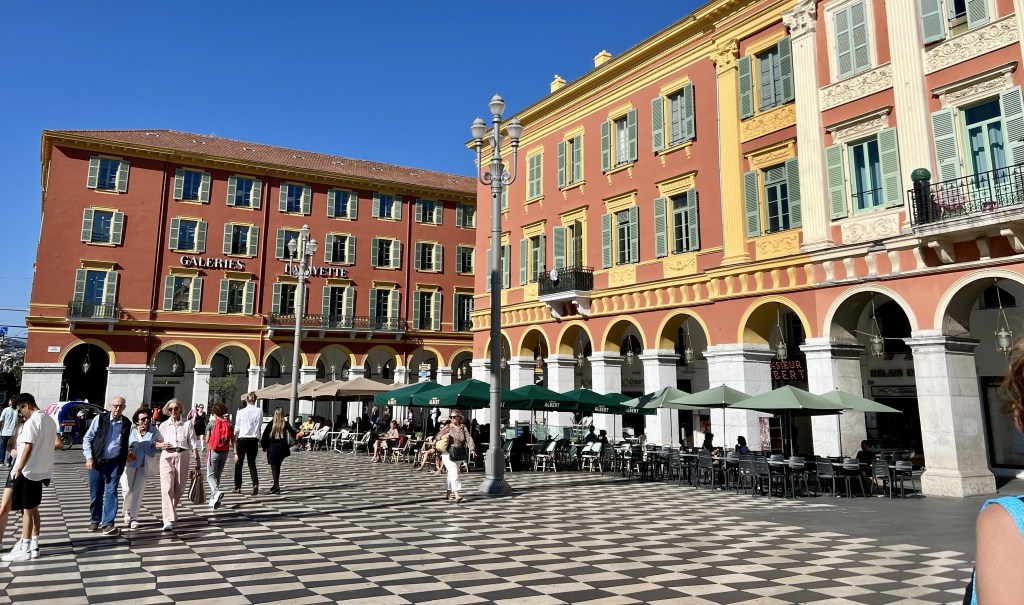 We wandered all over the place enthralled at the stunning facades of so many of the buildings, the gorgeous squares, fountains and gardens… including the Place Massena with its hypnotic checkerboard tilework, bright red buildings around the periphery, and a large fountain.