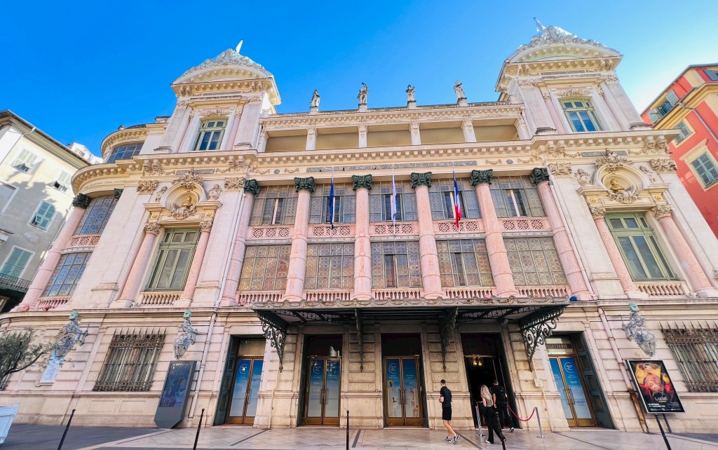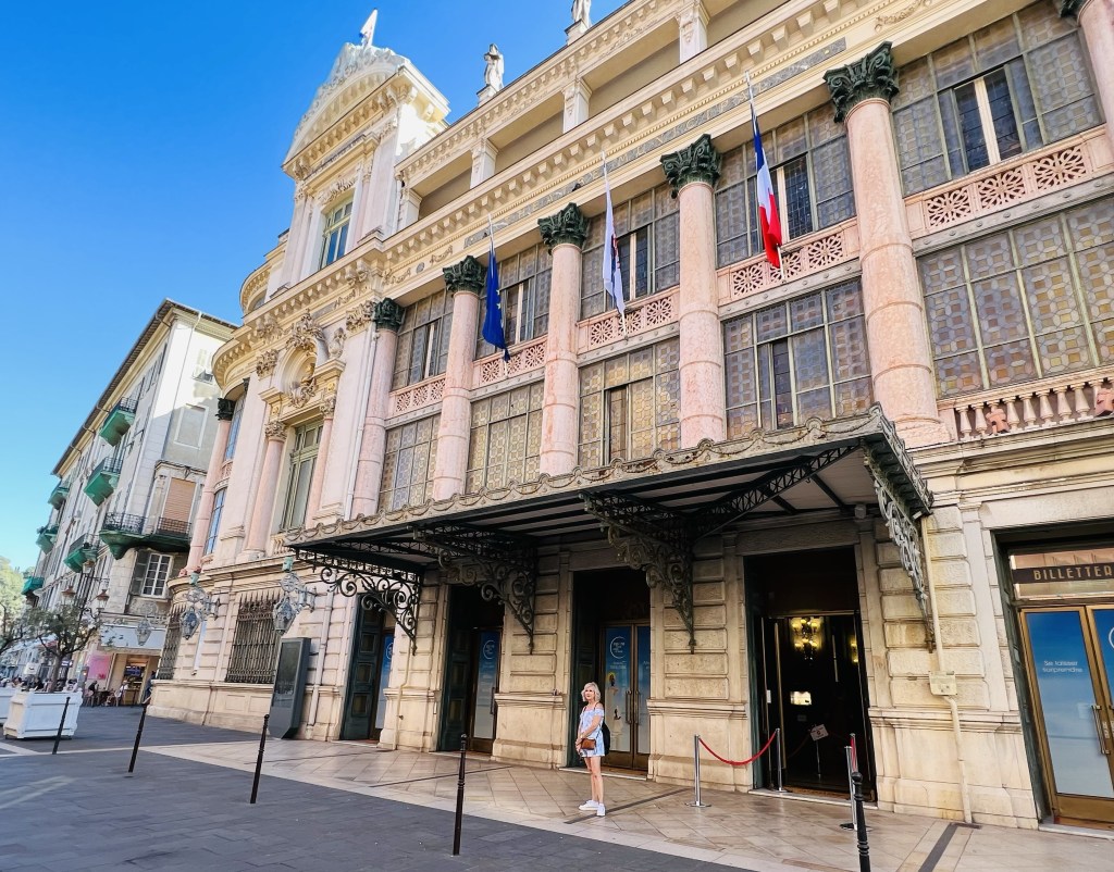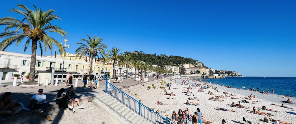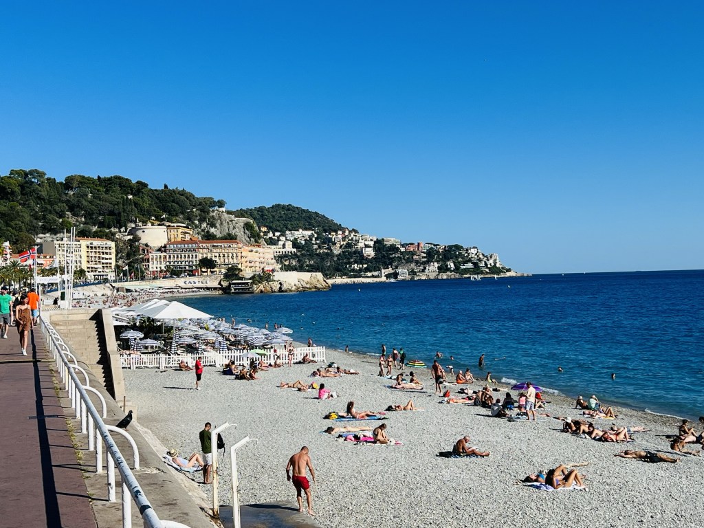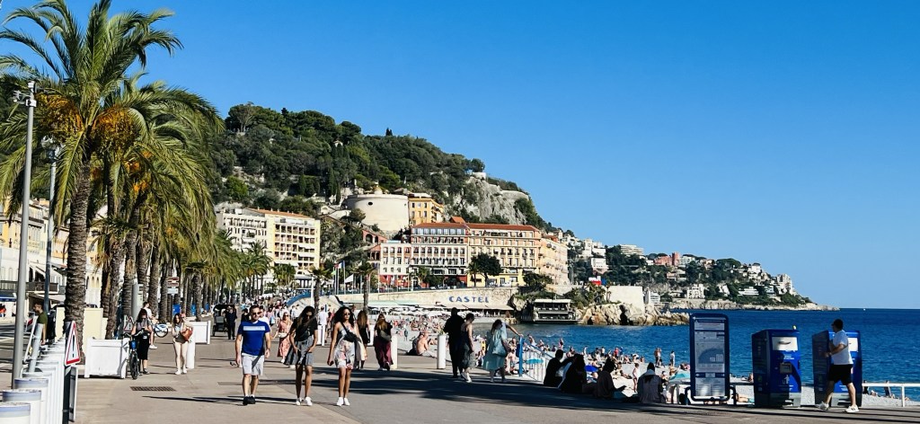 We felt we couldn’t miss that world-famous shoreline and strolled along the Promenade des Anglais (the English Walkway)- a very wide boardwalk right along the Mediterranean. It extends for miles and has access points down to the beaches (which are beautiful, but rocky).