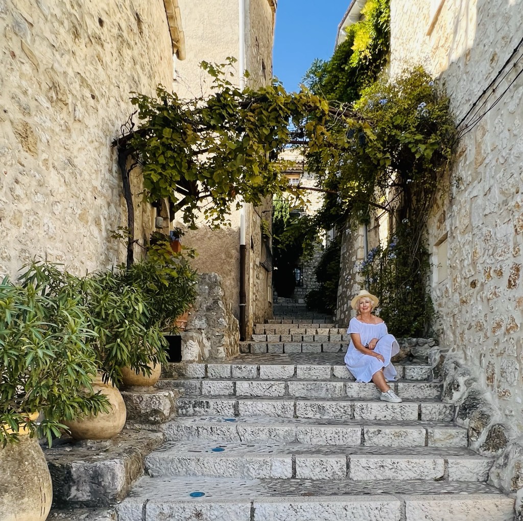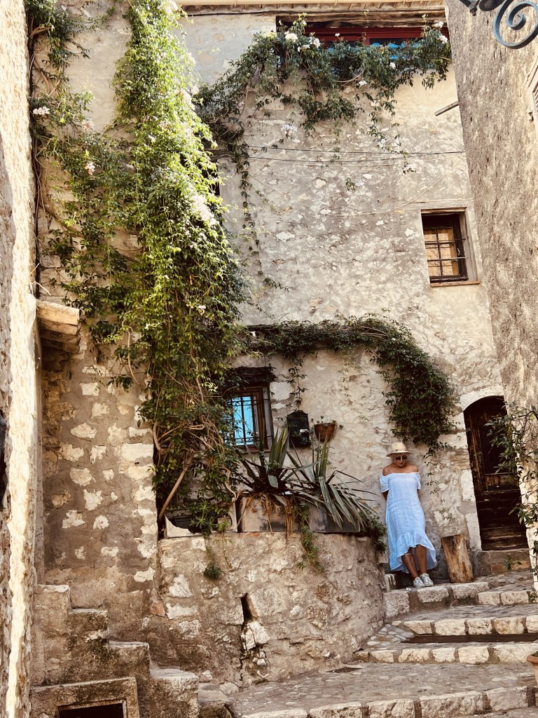 Today I had decided to go to Eze, a charming medieval town perched high on a hill over the Mediterranean, not far from Villefranche, that I had seen pictures of. I was pretty excited about this one… as I just knew I would love it! Anne was planning on having a rest day after our huge day yesterday in Nice, but she changed her mind and decided to come with me. So we donned our new pretty white linen dresses and off we went. An hour after we left home I have no doubt that she wished that she hadn’t!