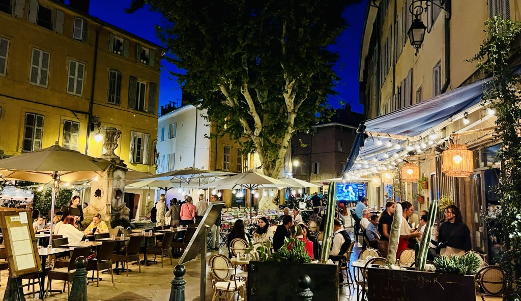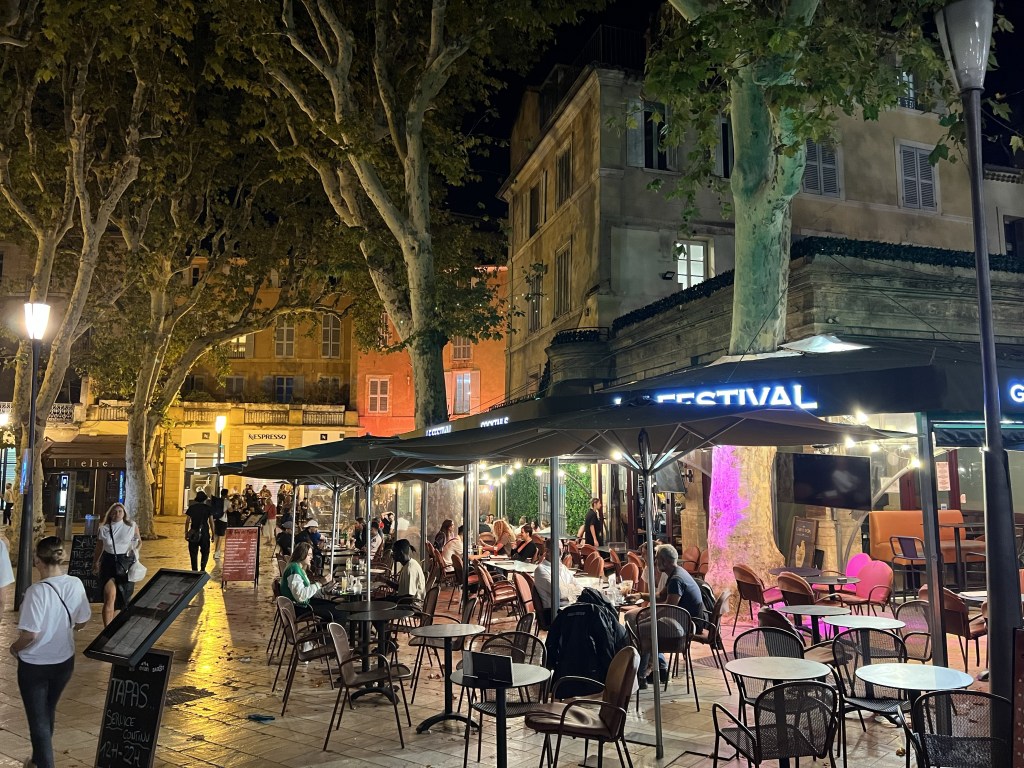 Sadly we did have to rush off to make the return bus as the next one was two hours away and we would have missed our next activity. We had really been looking forward to our fun and unique evening activity of grape stomping. Sounded like so much fun! So we were terribly disappointed to realise that there was just no way for us to get there without a car without spending another $300 for a driver. I had thought the vineyard was in Aix (or at least on the outskirts) but it was miles away with no transport at night. No grape stomping for us 😩. What a waste… and we could have sat longer and enjoyed the ambiance in our lovely restaurant.