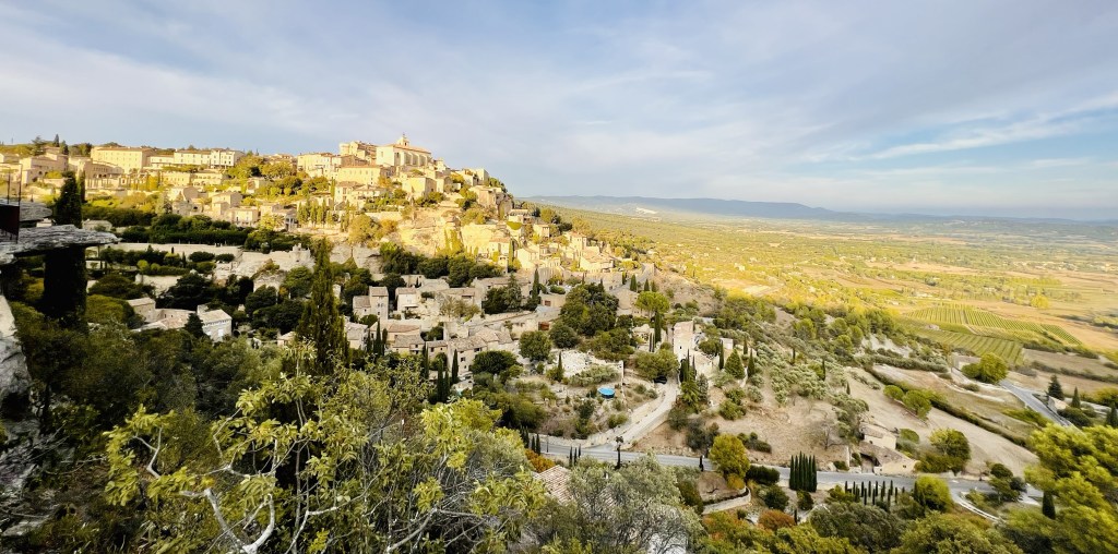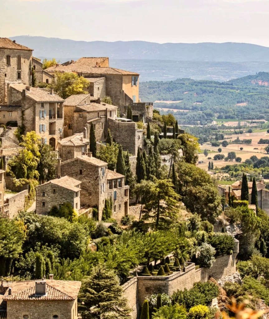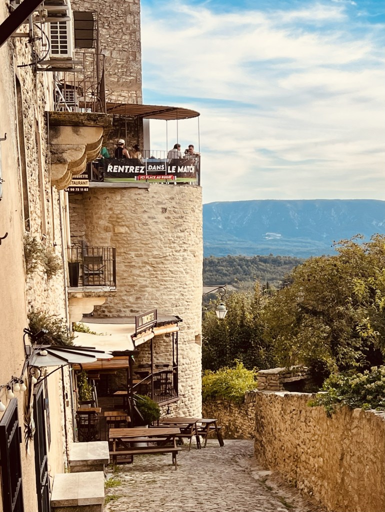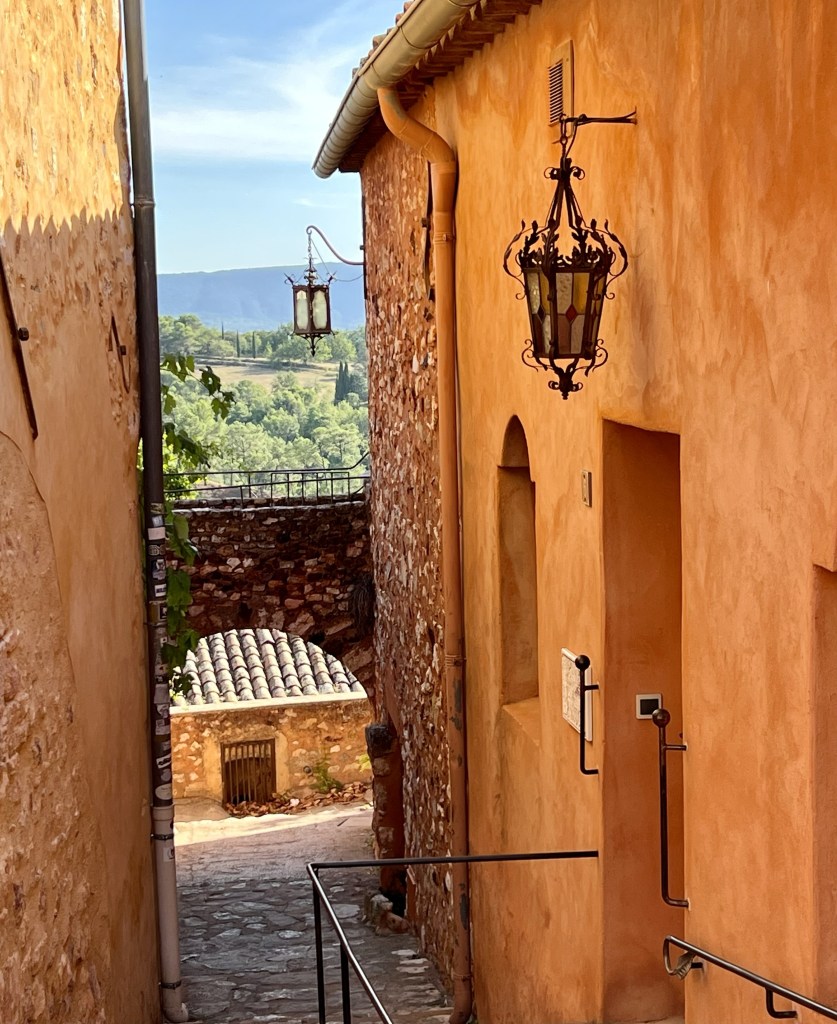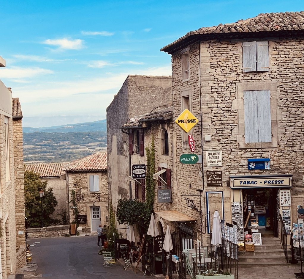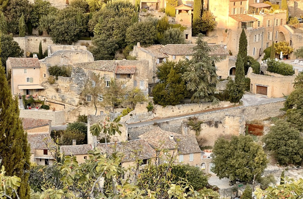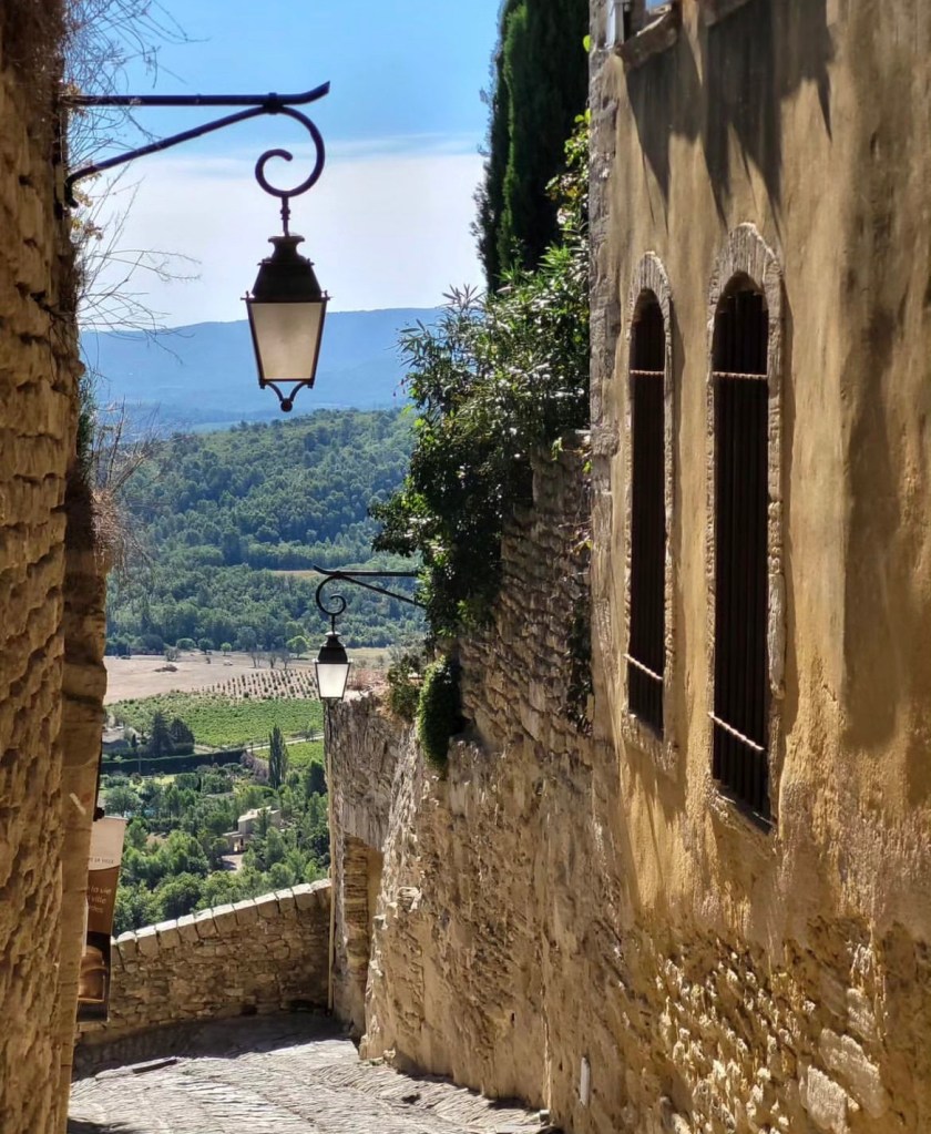 … which leads to the town square. And the main part of the village lies at the very top of the hill along the edge of a sheer cliff commanding sight lines along the entire valley. The market square where locals once gathered to watch public executions, is now home to many artisanal shops, cafes and restaurants full of breathtaking architecture and golden stones.