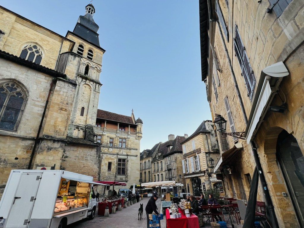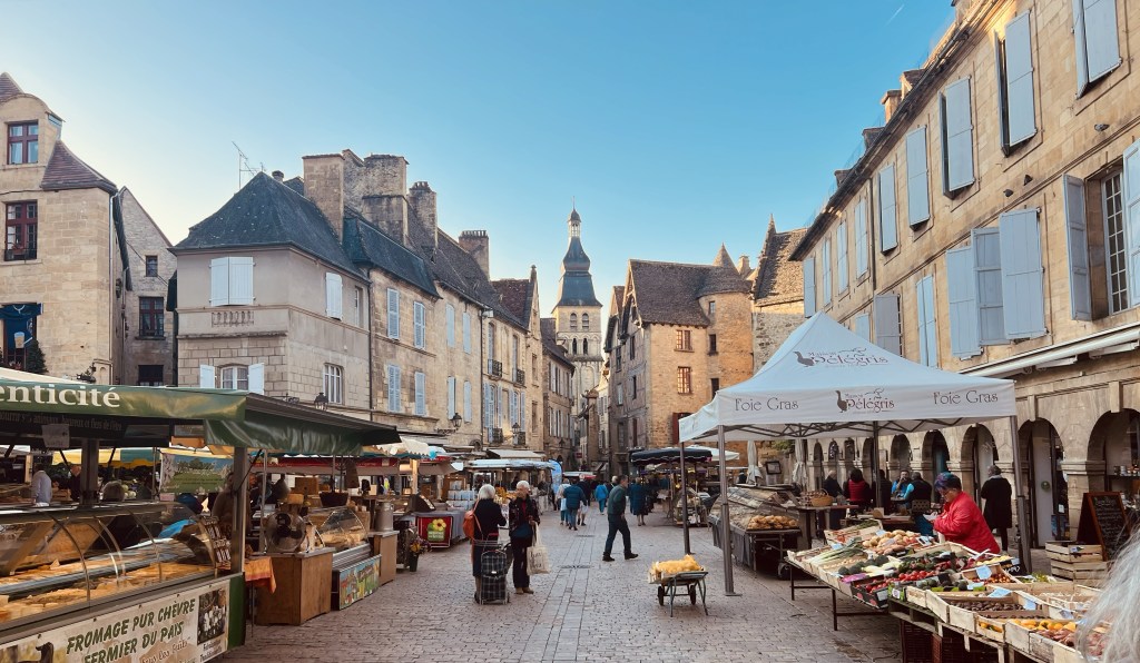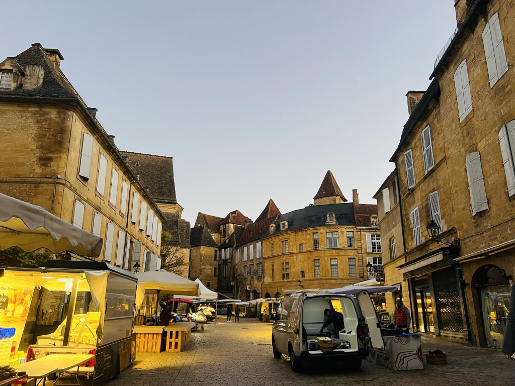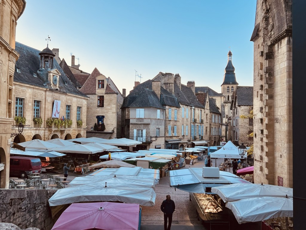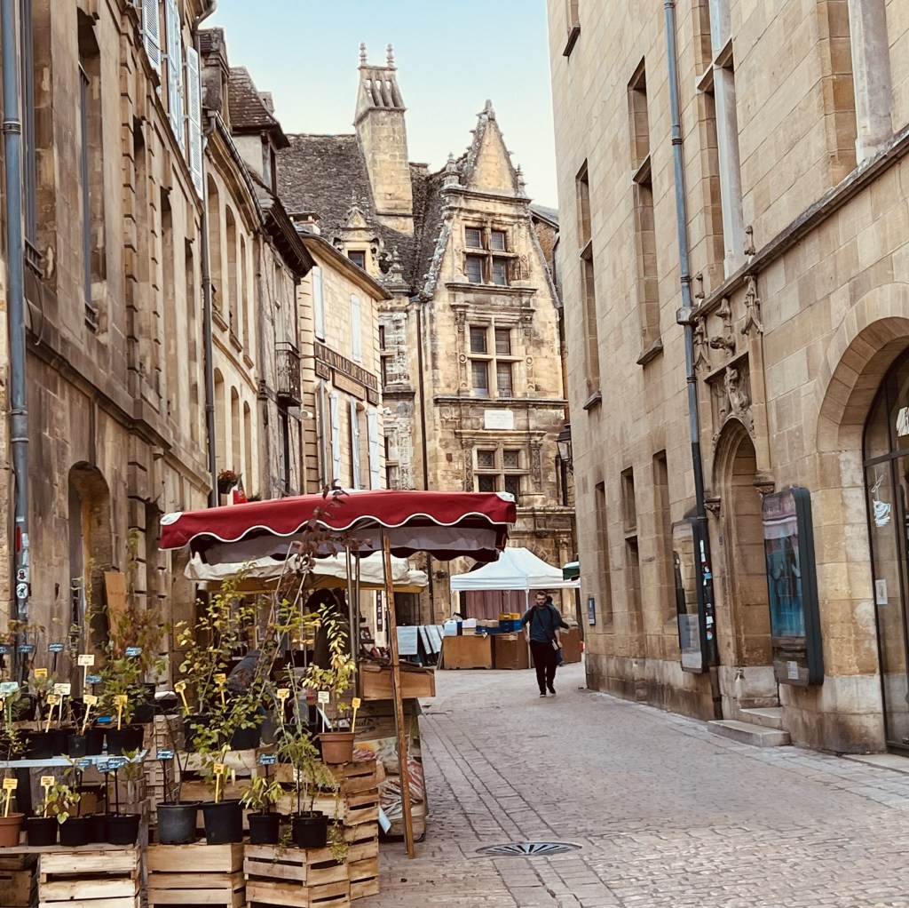 But I could immediately see how fantastic the this place was… that we had completely missed as our tired bodies dragged our bags through last night. I was excited! Sarlat is a beautiful medieval stone town that once again, feels like it is straight out of a movie. Apparently the best preserved medieval town in Europe… in fact it has the highest amount of historical buildings per square foot in the whole of France. Time seems to have stopped still here… with so much virtually unchanged since the days of seige and knights galloping over drawbridges. I have written about other places we have visited where history hangs over the narrow and winding cobbled lanes… the medieval plazas and churches… ancient doorways revealing snippets of bygone eras… but this was next level. The past feels wonderfully present here in this authentic medieval town and as I walked in the early morning, Sarlat’s renowned Saturday market was being set up…