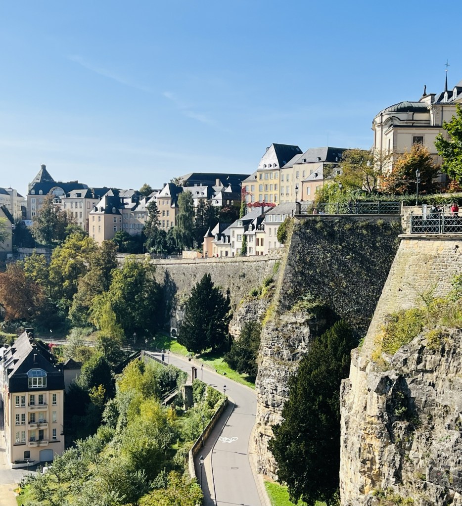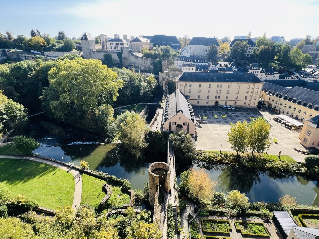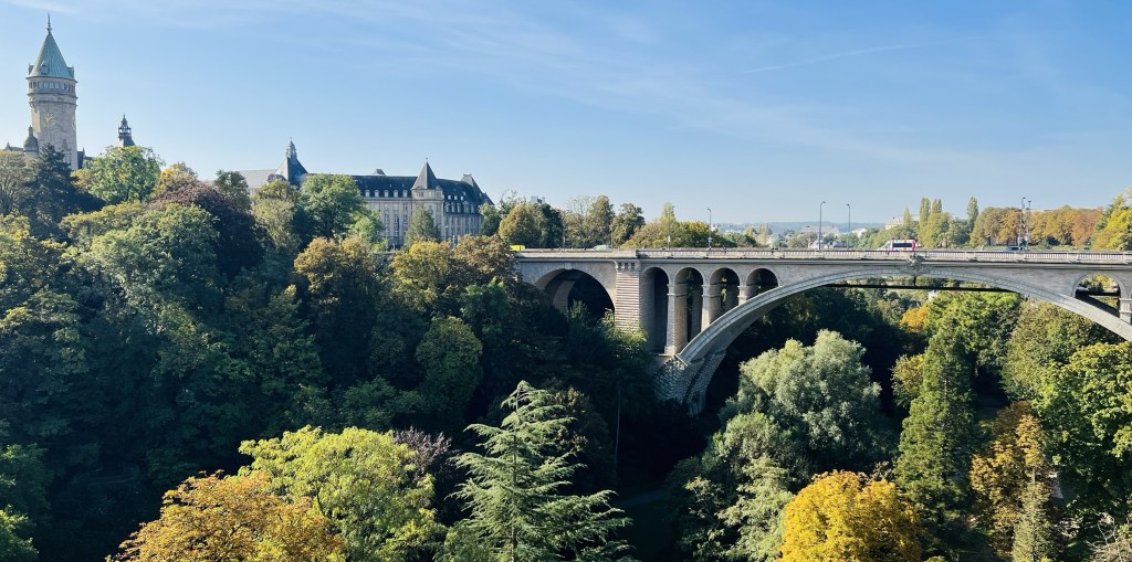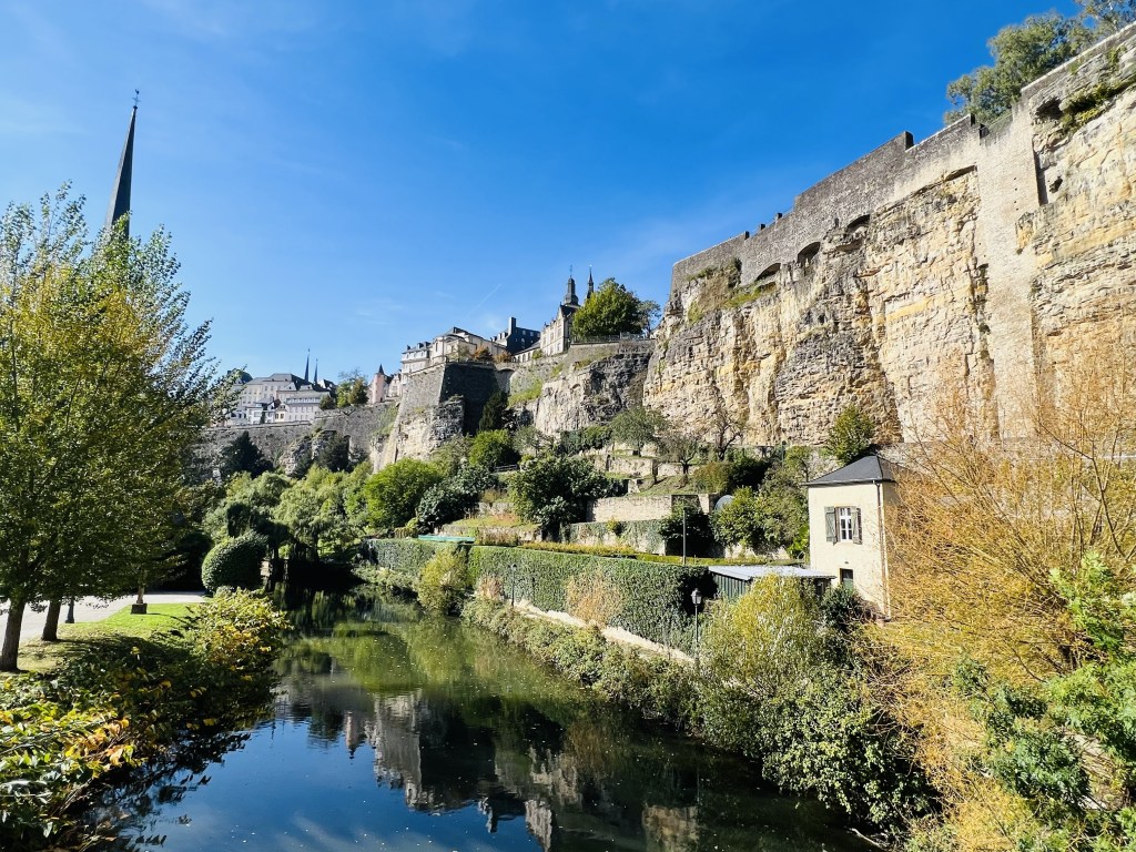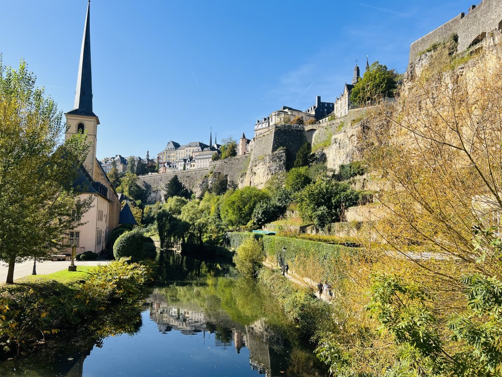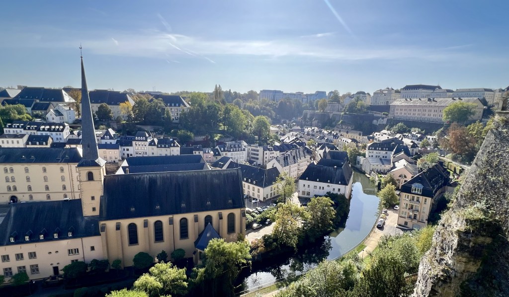 Luxembourg City is a small town where you can visit everything by foot… although not quite in a day but we did our best. It exists on two different levels: the upper town and the lower town. The upper town is the old town, and it was built in the 10th century. We wandered the Chemin de la Corniche which is often called the most beautiful balcony in Europe. It’s a lovely walk on a cobblestone pathway that winds down from above the steep fortified walls that surround the city in the old town, to the lower level. From the top the views of the Alzette Valley, the Grund (lower level) and also the roofs of houses in Luxembourg City, churches and cliffs are postcard worthy, with the quaint town and colourful trees below (as the leaves are definitely beginning to change with the coming autumn). In fact there are stunning views pretty much in every direction.