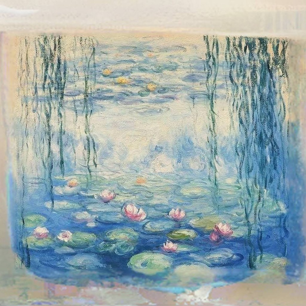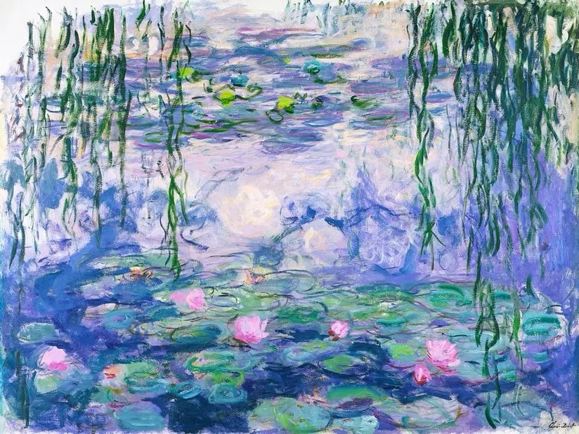 Monet produced many works painting outside… shimmering poplars, glowing haystacks, and my favourite and perhaps his most well known… iridescent sheets of water lilies in a blurry pastel palette. Unlike prior artists, Monet and the Impressionists aimed to capture the ephemeral, sensory effect of a scene — the impression — objects made on the eye in a fleeting instant. They used fast and loose brushwork, a lighter palette, and tried to capture the effects of light. Monet is thought to have “invented” light.
